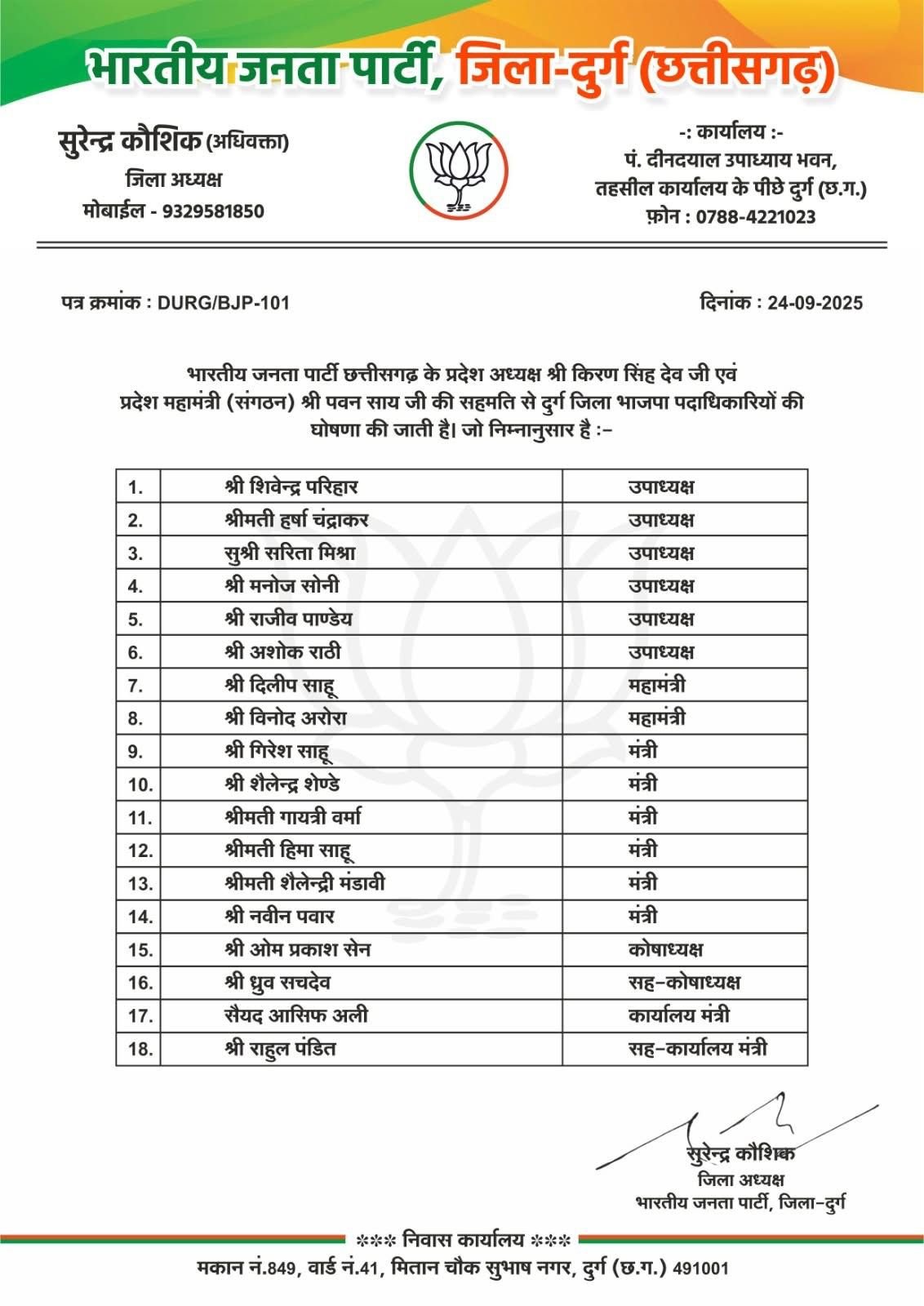दुर्ग : भाजपा प्रदेश अध्यक्ष श्री किरण सिंह देव जी एवं प्रदेश महामंत्री संगठन श्री पवन साय जी की सहमति से दुर्ग जिला भाजपा की बहूप्रतीक्षित कार्यकारिणी की आज घोषणा भाजपा दुर्ग जिला अध्यक्ष सुरेंद्र कौशिक ने अपनी नई पदाधिकारी की घोषणा की है।