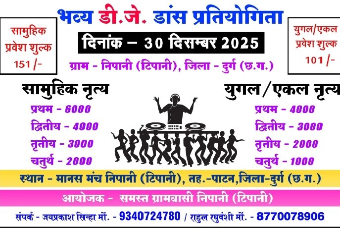 Cg24News-R :- ग्राम निपानी में समस्त ग्रामवासियों के सहयोग से 30 दिसंबर मंगलवार को रात्रिकालीन भव्य डीजे डांस प्रतियोगिता का आयोजन किया गया है कार्यक्रम में इनामों की घोषणा निम्नानुसार की गई है। सामुहिक नृत्य प्रथम इनाम – 6000 /- प्रथम इनाम – 4000 /- प्रथम इनाम – 3000 /- प्रथम इनाम – 2000 /- युगल एवं एकल नृत्य