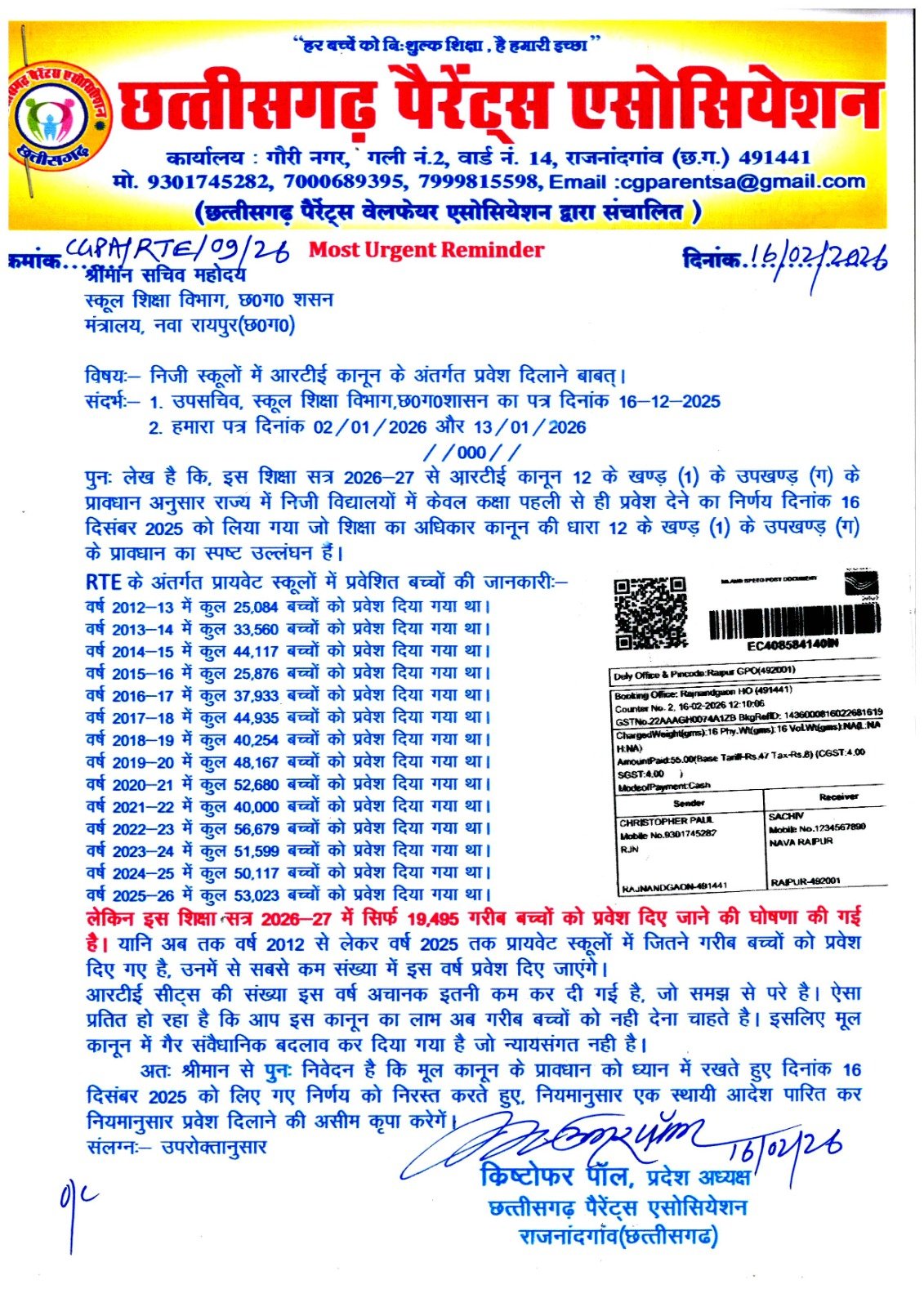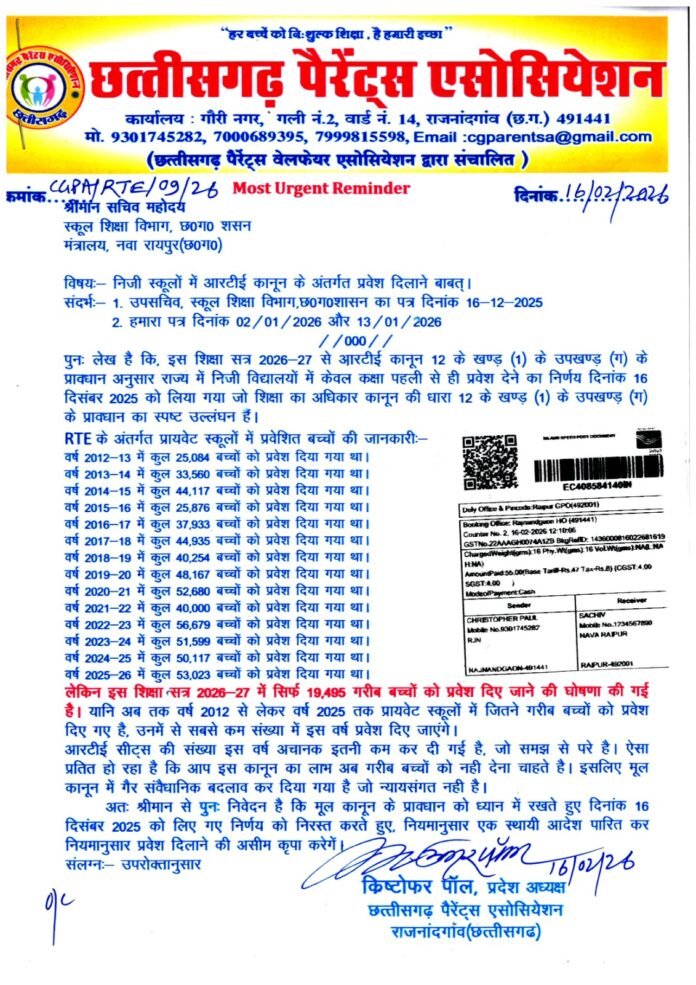 रायपुर। शिक्षा का अधिकार कानून में 16 दिसंबर 2025 को किए गए बदलाव का खामियाजा यह हुआ कि इस वर्ष सिर्फ 19,495 सीटों पर ही गरीब बच्चों को प्रायवेट स्कूलों में प्रवेश मिल पाएंगा, जिसको लेकर छत्तीसगढ़ पैरेंट्स एसोसियेशन के प्रदेश अध्यक्ष क्रिष्टोफर पॉल लगातार विरोध कर रहे है।