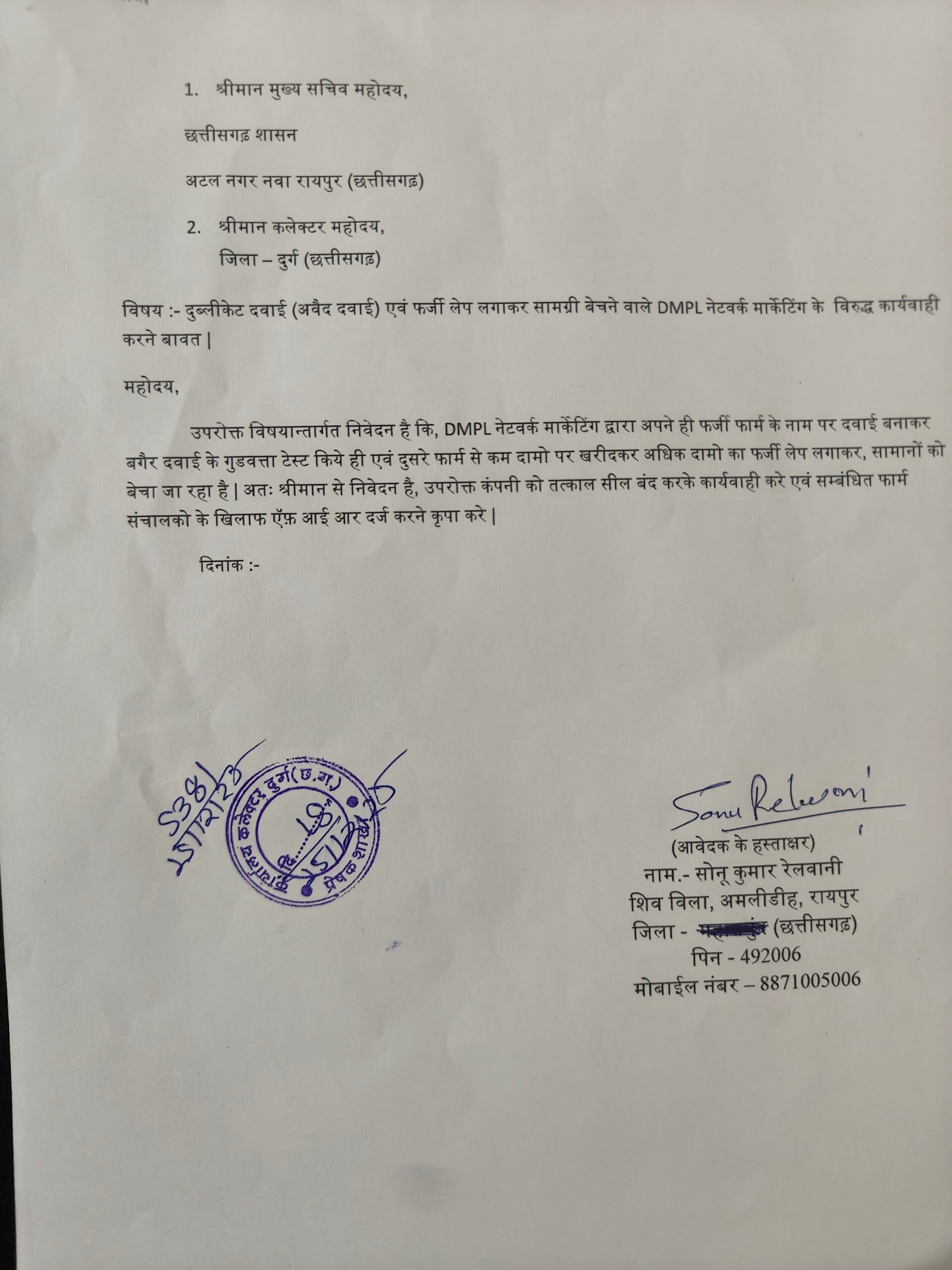 शिकायतकर्ता सोनू कुमार रेलवानी ने बताया कि मामले की शिकायत जिला कलेक्टर और एसपी दुर्ग से की गई है। यदि जल्द कार्रवाई नहीं हुई तो राजधानी रायपुर में संबंधित अधिकारियों और मंत्रियों से शिकायत की जाएगी।