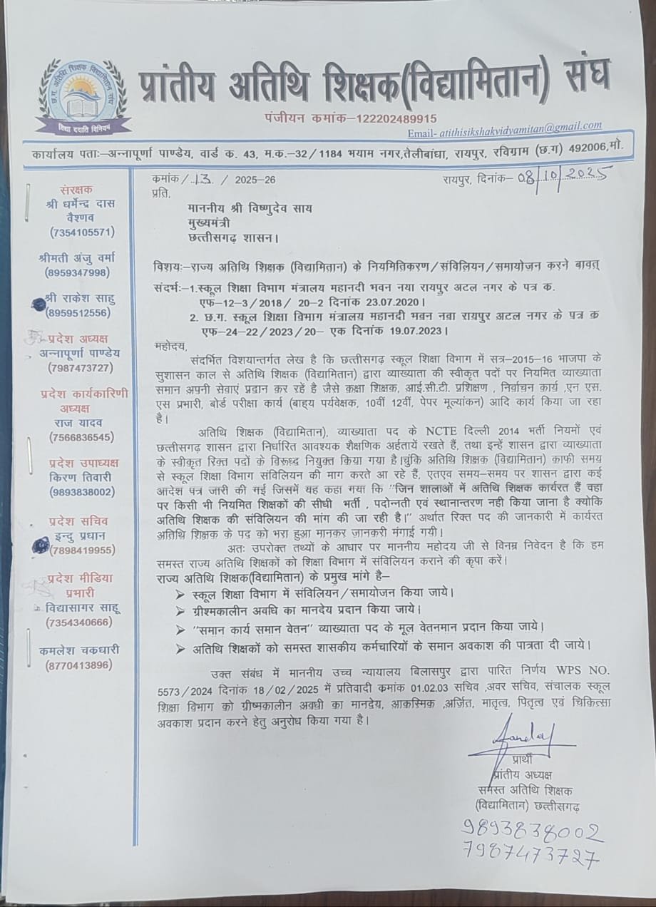 रायपुर: अतिथि शिक्षकों के प्रतिनिधिमंडल ने 08 अक्टूबर 2025 (बुधवार) को माननीय मुख्यमंत्री महोदय जी से सौजन्य भेंट की। यह मुलाकात अत्यंत ही सकारात्मक और उत्साहजनक रही।