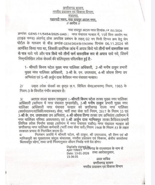 दरअसल, बिलासपुर जिले की नगर पंचायत मल्हार में पदस्थ रहते हुए तत्कालीन सीएमओ किरण पटेल पर जेम पोर्टल के माध्यम से गंभीर अनियमितताओं के आरोप लगे थे। 15वें वित्त आयोग मद के तहत 2 मिनी टिप्पर की खरीदी के लिए आमंत्रित निविदा प्रक्रिया में नियमों की अनदेखी की गई।
