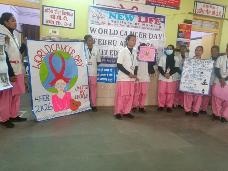 बैकुंठपुर -न्यू लाइफ हेल्थ एण्ड एजुकेशन सोसायटी द्वारा संचालित न्यू लाईफ इंस्टिट्यूट आफ नर्सिंग में 04 फरवरी 2026 को विश्व कैंसर दिवस के उपलक्ष्य में संस्था संचालक डाॅ. प्रिंस जायसवाल के निर्देशन एवं मार्गदर्शन में नर्सिंग छात्र-छात्राओं एवं फैकल्टी सुश्री संगीता चिकनजुरी एवं श्रीमती लुकेश साहू के द्वारा स्वास्थ्य प्रशिक्षण का आयोजन किया गया। विष्व कैंसर दिवस 2026 की थीम ‘‘युनाइटेड बाय युनिक‘‘ है जो की 2025 से 2027 तक चलने वाला 3 वर्षीय अभियान की शुरूआत को दर्शाती है। इस थीम का मुख्य उद्देश्य प्रत्येक कैंसर रोगी की व्यक्तिगत यात्रा को महत्व देना और कैंसर उपचार को व्यक्तिगत देखभाल और समावेशिता को बढ़ावा देना है। जिसमे न्यू लाईफ इंस्टिट्यूट आफ नर्सिंग के चतुर्थ सेमेस्टर के विद्यार्थियों द्वारा जिला अस्पताल, बैकुण्ठपुर में एक विशेष जन-जागरूकता कार्यक्रम का आयोजन किया गया। वर्तमान समय में कैंसर एक गंभीर बिमारी है, कैंसर कोशिकाओं का असामान्य तौर पर वृद्धि होना एवं अनियंत्रित रूप से विभाजित होना है। कैंसर के प्रकार- मुख कैंसर, स्तन कैंसर, सर्वाइकल कैंसर, ब्लड कैंसर, स्किन कैंसर, बोन कैंसर, प्रोस्टेट कैंसर एवं लंग कैंसर के बारे में लोगो को शिक्षित किया गया। समान्यतः कैंसर के कारण जैसे- तंबाकू, धूम्रपान के सेवन मुंह का कैंसर, फेफड़ो का कैंसर होने का खतरा ज्यादा होता है। कैंसर के लक्षण- वजन कम होना, थकान, स्तन में गांठ, त्वचा के बदलाव एवं सीने में दर्द होना है। कैंसर का इलाज- केमोथेरेपी, रेडियो थेरेपी एवं सर्जरी मुख्यतः है। प्रति वर्ष भारत में 14 लाख व्यक्ति कैंसर से पीड़ीत हो रहे है। संस्था संचालक डाॅ. प्रिंस जायसवाल के द्वारा नर्सिंग संस्थान में विश्व कैंसर दिवस के अवसर पर समस्त स्टाॅफ एवं छात्र-छात्राओं को शपथ दिलवाया गया।
