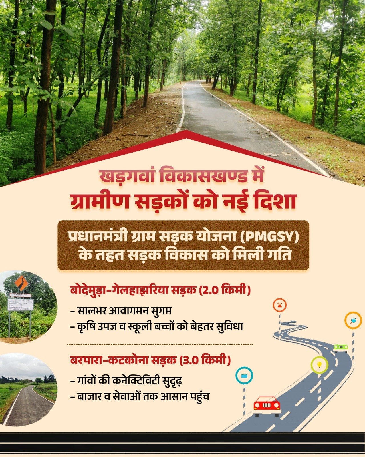 प्रधानमंत्री ग्राम सड़क योजना के तहत बरपारा से कटकोना तक 3.0 किलोमीटर लंबी संपर्क सड़क का निर्माण स्वीकृत किया गया है। इस मार्ग के निर्माण से कटकोना, बरपारा तथा आसपास के ग्रामों की कनेक्टिविटी सुदृढ़ होगी। किसानों एवं श्रमिकों को बाजारों तक बेहतर पहुंच मिलेगी तथा वर्षा ऋतु में भी परिवहन निर्बाध रहेगा। यह सड़क ग्रामीण पर्यटन, सामाजिक कार्यक्रमों एवं जनसुविधाओं को बढ़ावा देने में सहायक सिद्ध होगी। इन परियोजनाओं के पूर्ण होने से खड़गवां विकासखण्ड में सड़क अवसंरचना को नई दिशा मिलेगी। सरकार की यह पहल न केवल भौतिक संपर्कता को सुदृढ़ करेगी बल्कि ग्रामीण अर्थव्यवस्था, सामाजिक विकास और जनकल्याण की गति को भी तेज करेगी।