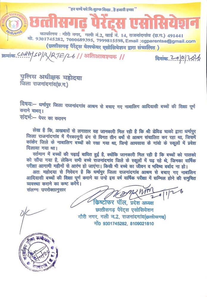 छत्तीसगढ़ पैरेंट्स एसोसिएशन के प्रदेश अध्यक्ष क्रिस्टोफर पॉल ने मंगलवार को पुलिस अधीक्षक, राजनांदगांव को पत्र लिखकर चिंता जताई है।